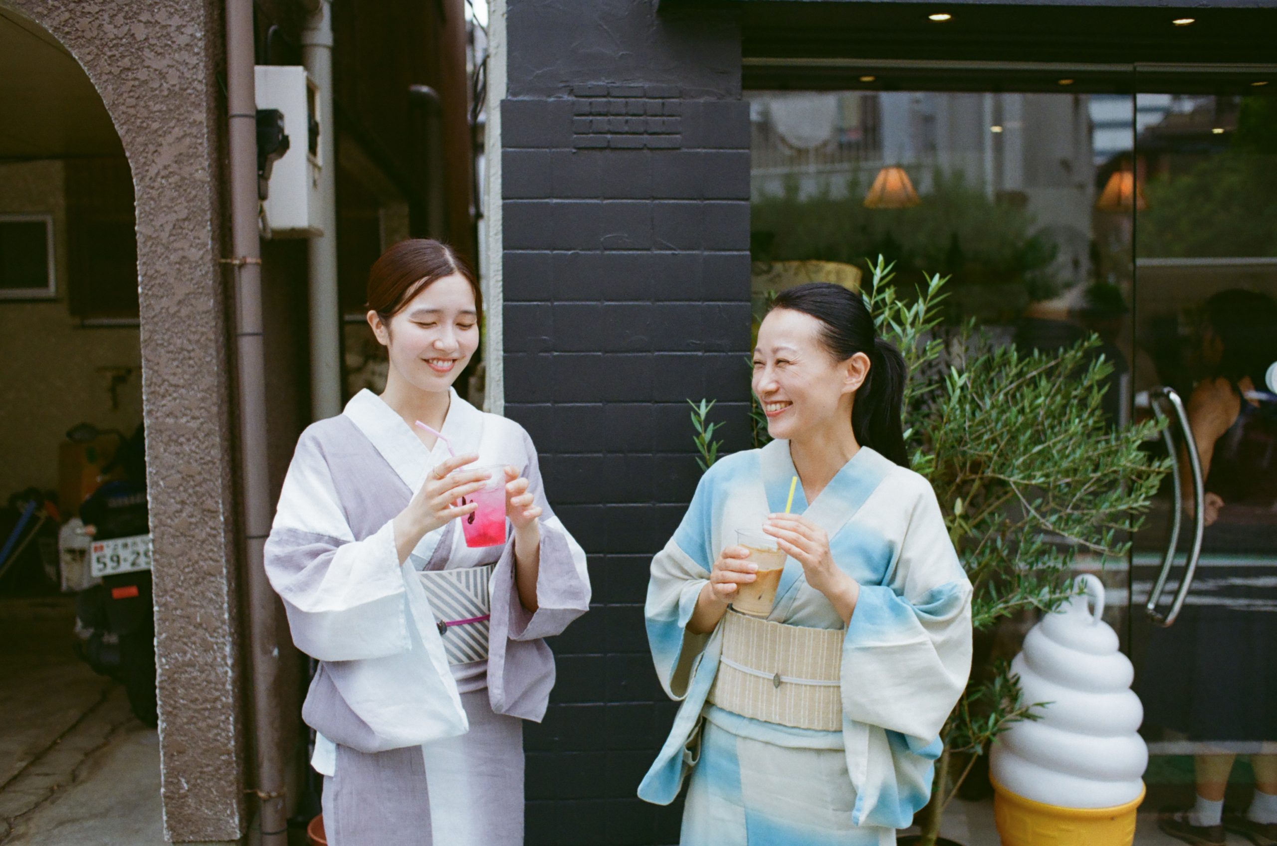 浴衣姿で二人は、セレクト古書店ATELIERに向かい、それぞれ気になる本を購入。「手触りのある本が好きなんです」と話す伊藤さんは、いくつもの本を手に取り、見て、触って、今の自分が惹かれる一冊を選んでいました。本の詳細は記事の前・後編でお話しいただいているので、楽しみにしていてくださいね。 本を購入した二人は、ATELIERの近くにあるカフェyoshida coffee sangubashiに行き、カフェラテと赤紫蘇ソーダをテイクアウト。浴衣を着るのはお祭りのようなイベント時だけを想像するかもしれませんが、日常に浴衣を取り入れる心地の良さを体験したharu.さん。