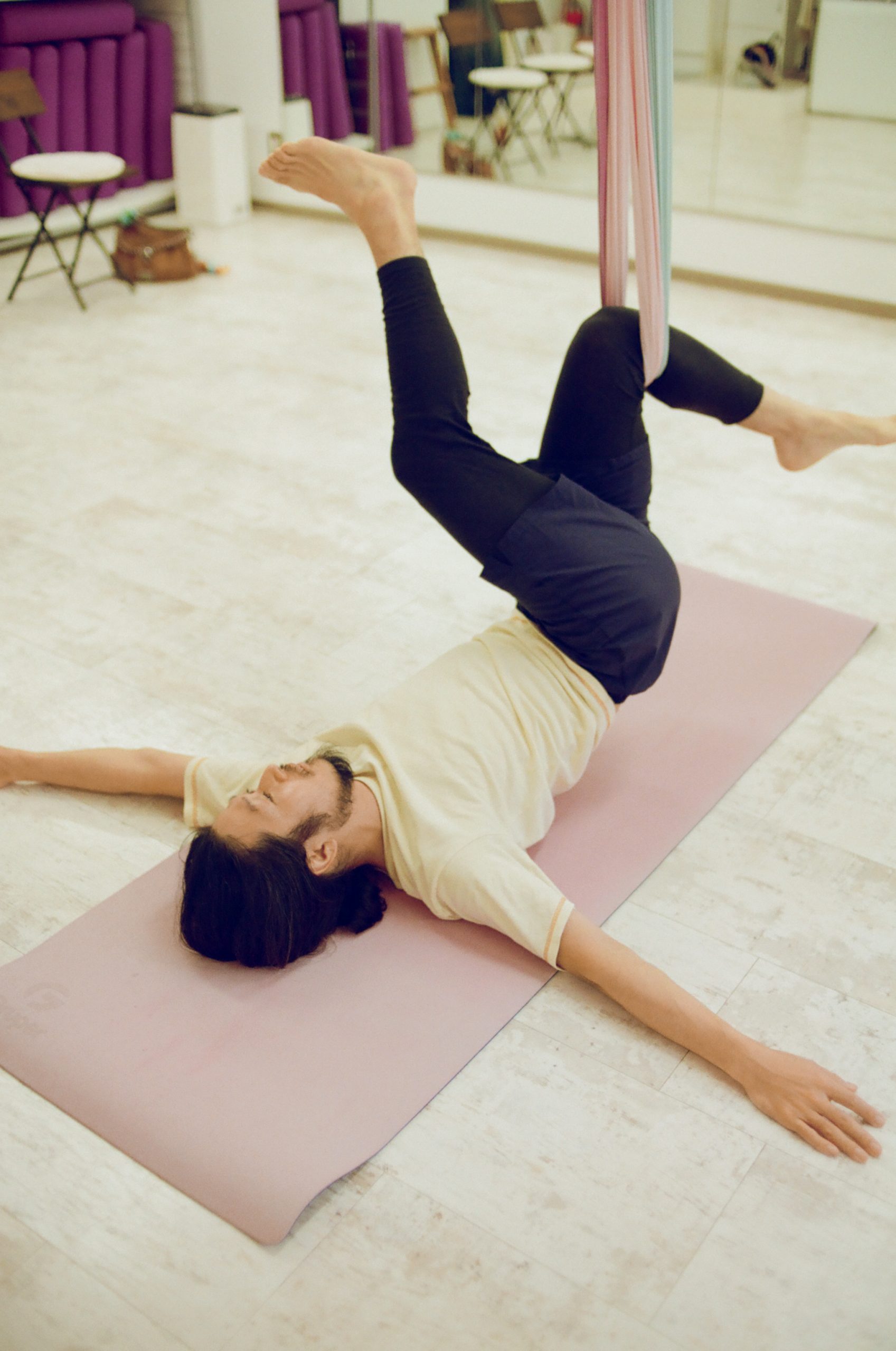 haru._フライングヨガとは関係ない感想ですけど、その長さんの視点がいいですよね。 長さんの方に意識を向けたら、腹から笑っちゃうから、私は長さんから発せられる波動を一度無視して、全集中していました。フライングヨガって、普段だったら絶対にしない体勢になるじゃないですか。そのときに、「身を委ねるってめっちゃ気持ちいいんだな」って思いました。
