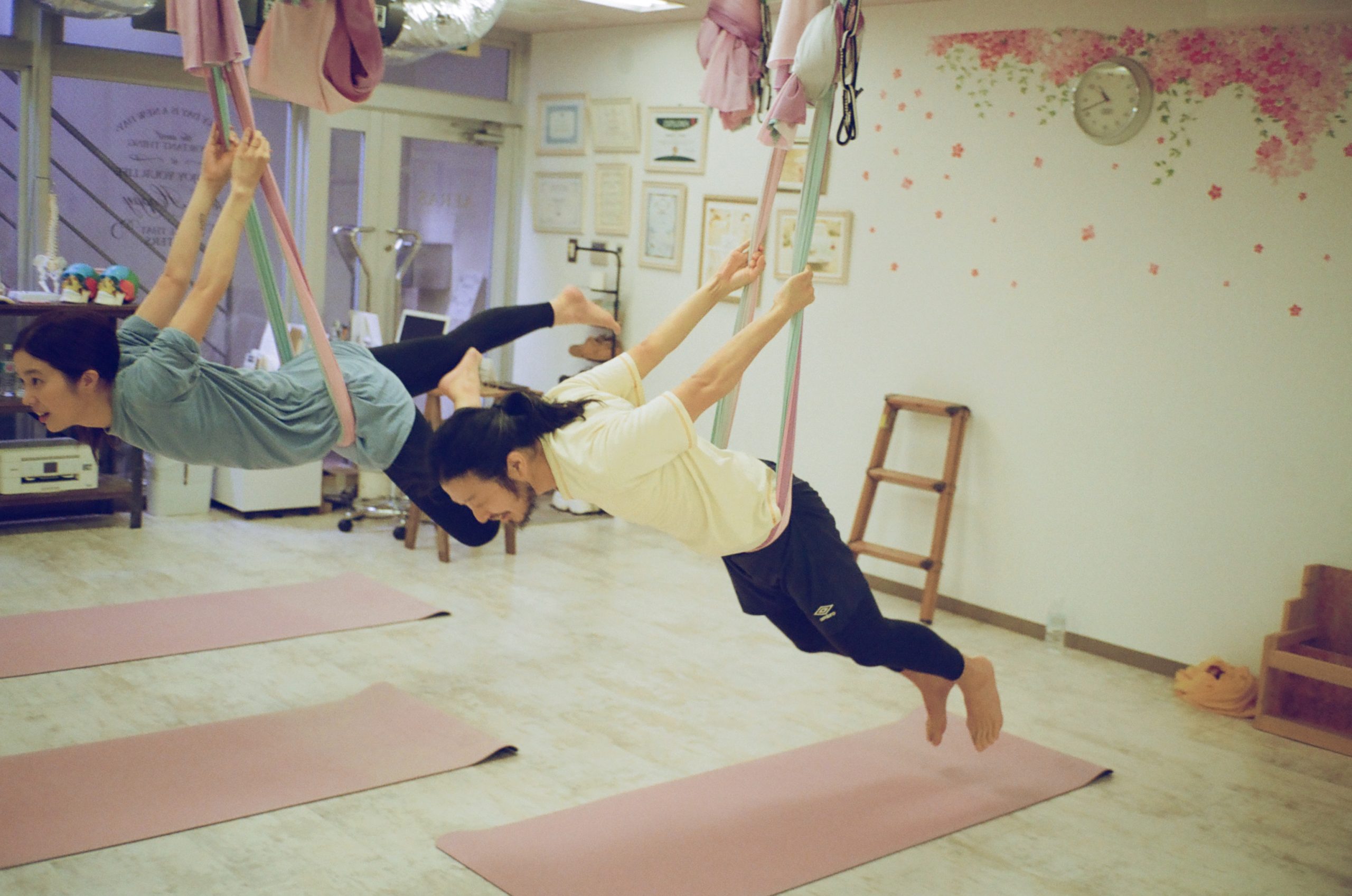 長さんも普段の日常では決してすることのない体勢に驚きながらも、バッタのポーズ、ダウンドッグ、そして鼠蹊部をハンモックに固定させ、手足を浮かせ、宙を舞うポーズまでしっかりととることができていました。