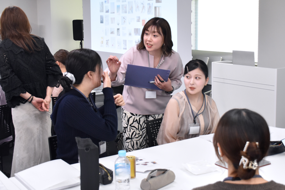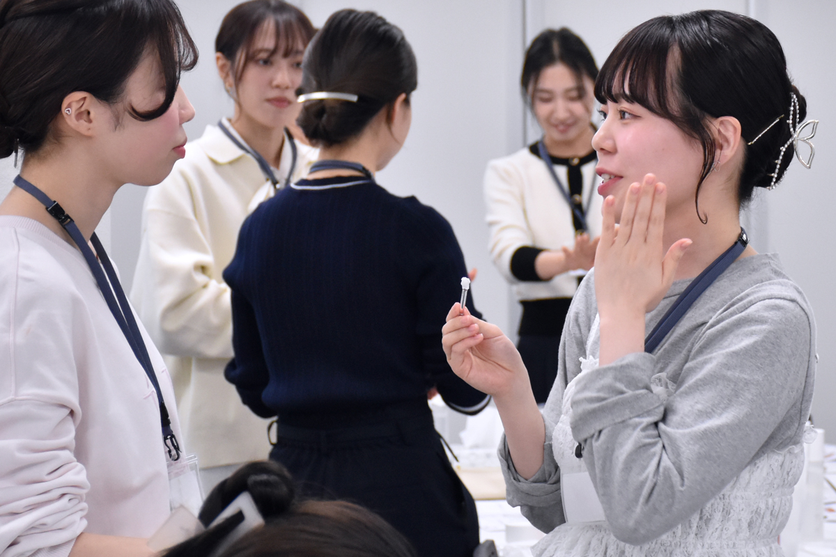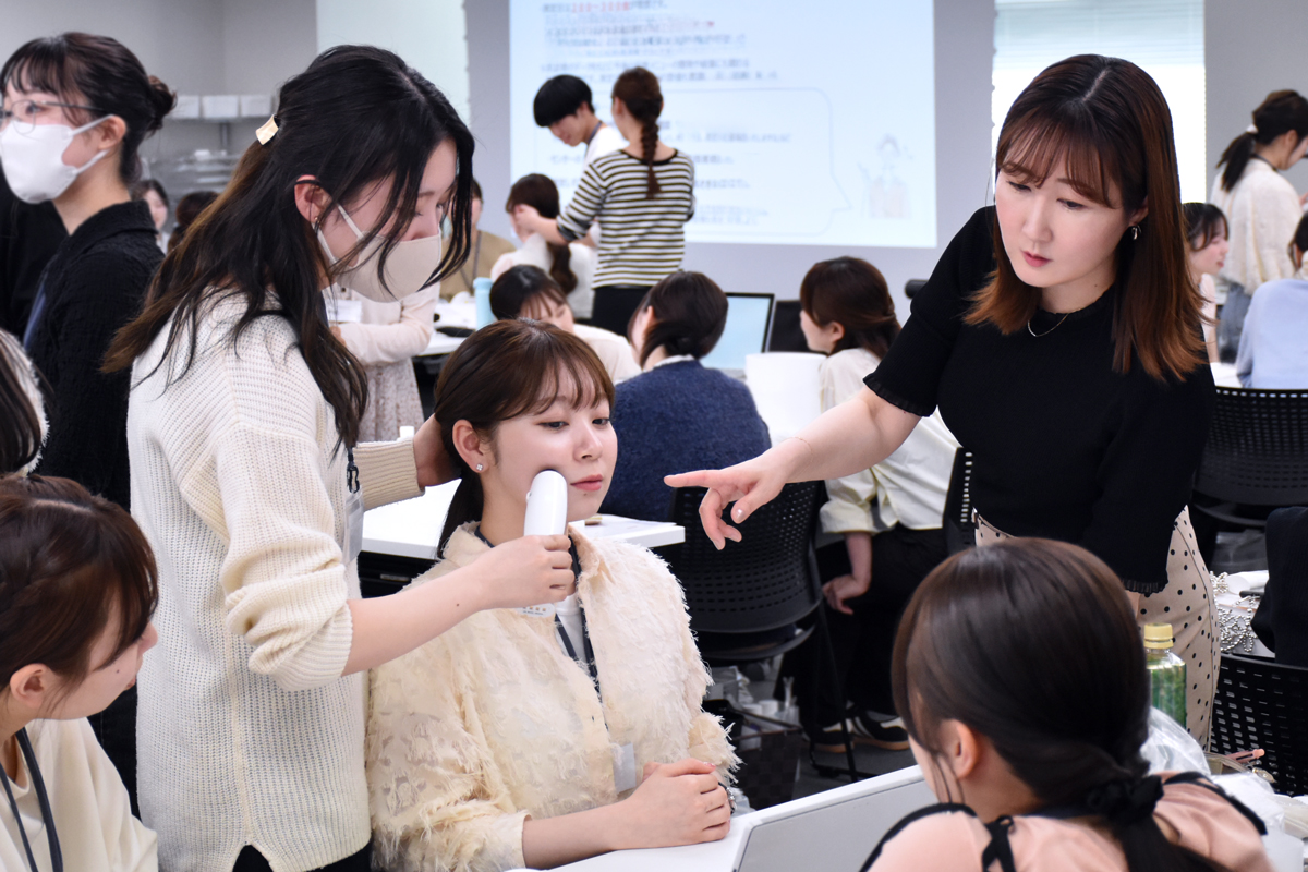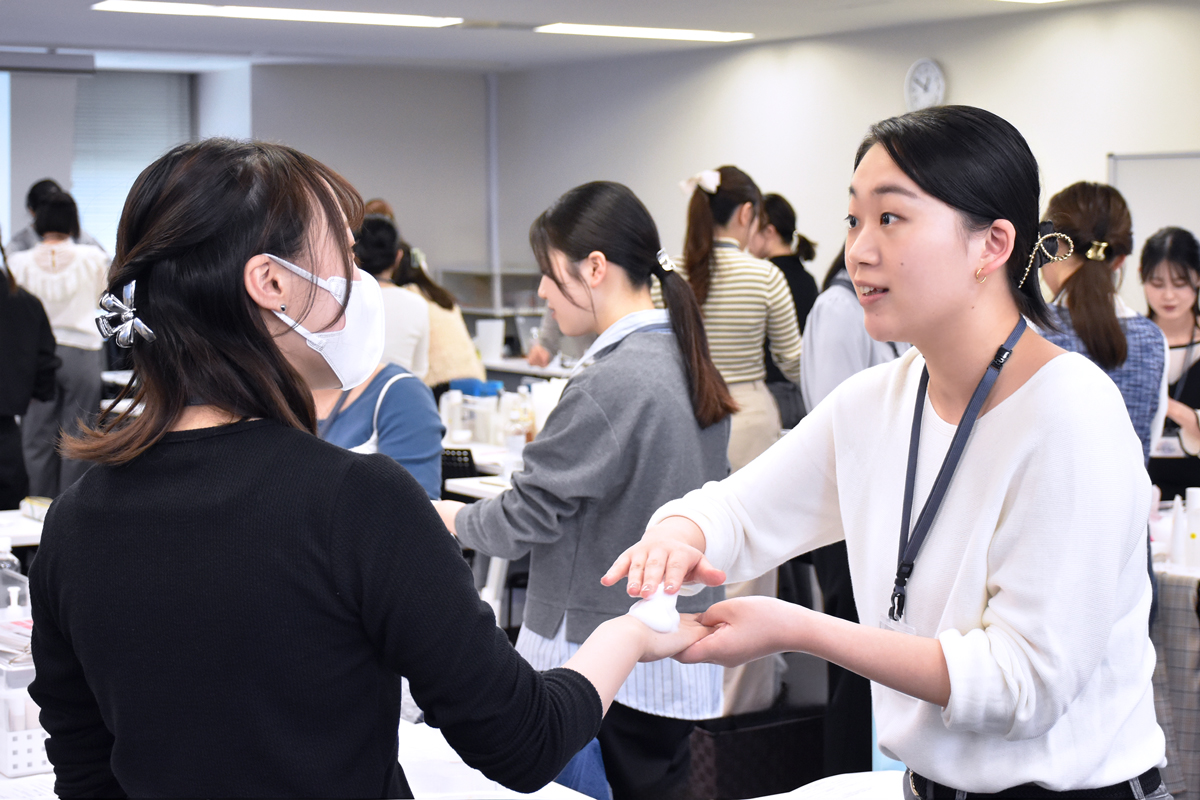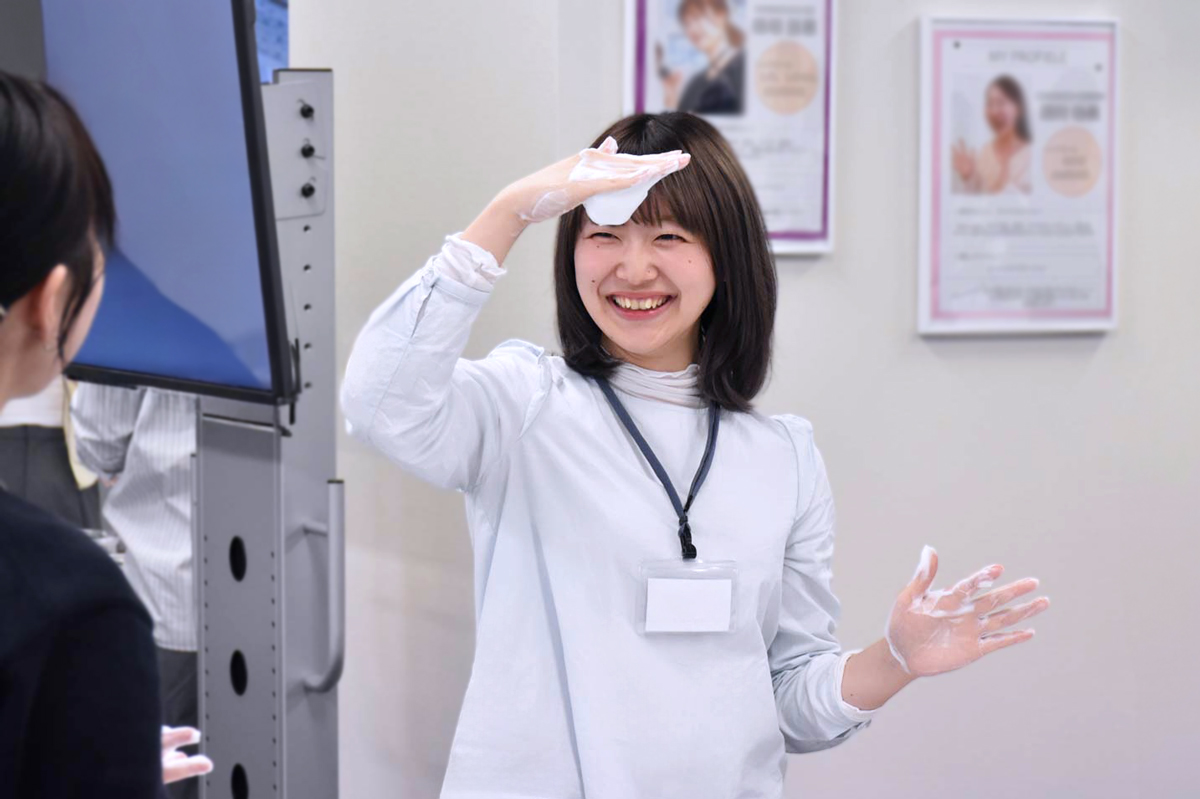 肌に直接ふれるタッチアップや、水場でのデモンストレーションなど、店舗でのリアルなシーンを想定しながら実践を重ねます。