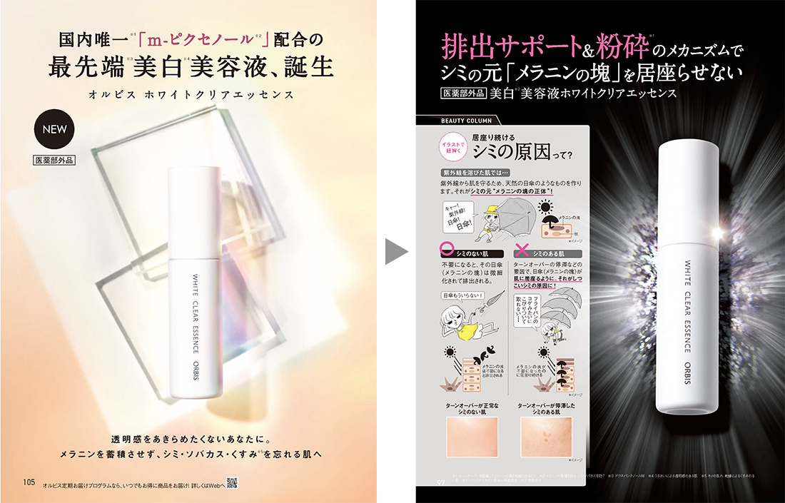 発売時は透明感を象徴する明るい雰囲気の誌面作りをしていましたが、方向性を変えて黒を基調とした強めのビジュアル表現に刷新しました。メインコピーも従来使っていた「キメ」「透明感」という訴求ワードから、配合されている美白有効性分が本来持つ機能の強みを全面に押し出し、独自性となる「メラニンの塊を粉砕して排出をサポート」という、お客様が美容液の効果を理解しやすい表現に変えました。合わせて、狙いたいターゲットに対する課題を再設定し、ポーラ・オルビスグループ独自の成分が配合されている効果感と他の美白成分との差異・独自性を明確に打ち出しました。
