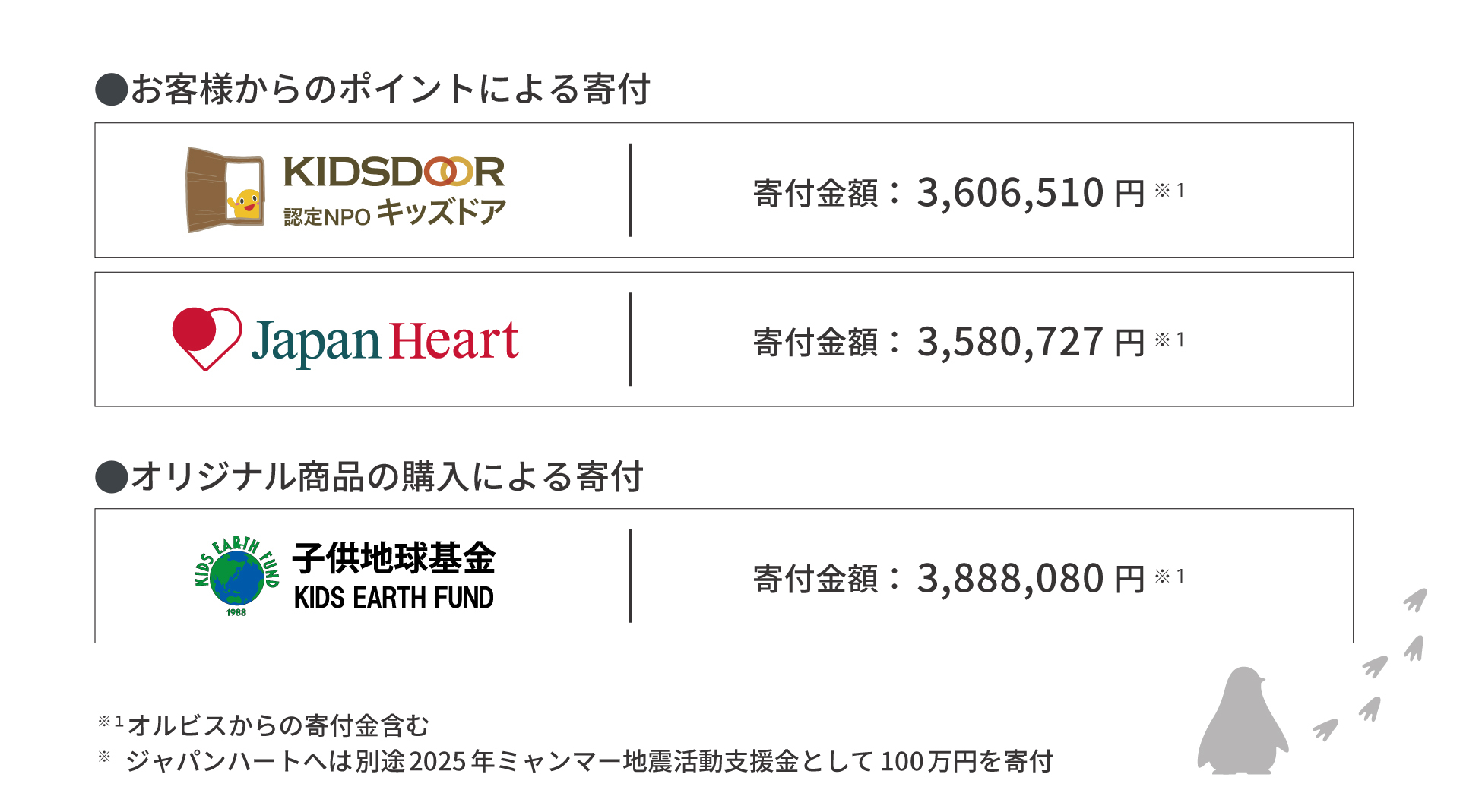 2025年度は、延べ126,582件のご支援をお寄せいただきました。お客様からお預かりした寄付金にオルビスからの寄付金を合わせて、合計11,075,317円を3つのパートナー団体にお届けいたします。